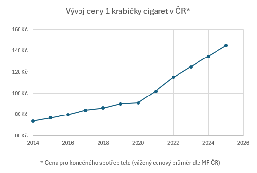 Níže uvádíme pro zajímavost historický vývoj ceny 1 krabičky cigaret v rámci České republiky (zdroj). Zatímco v roce 2014 stála krabička s 20 kusy cigaret průměrně 74 Kč, v roce 2025 se její cena vyšplhala na dvojnásobek.