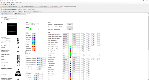 Software EScribe jsme testovali v nové verzi vyvinuté pro potřeby DNA zařízení OXVA. Připojení kabelem ze základního balení je bezproblémové a hladké, zařízení se k PC automaticky připojí a po instalaci softwaru si ho jednoduše otevřete a připojíte do programu svůj Xlim. Nastavení je opravdu bohaté, od základních prvků jako je úprava maximální délky potahu, až po komplexní úpravu celého UI a všech ikon a LED indikací. Pokročilí uživatelé si zaručeně vyhrají.