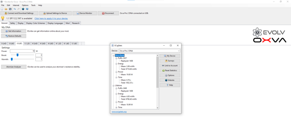 Součástí softwaru je také statistický program ECigStats, který vám podá informaci o vaší baterii, počtu potahů, počtu replikovaných potahů, délku vašich potahů, apod. Pro tyto účely potom můžete spustit také podprogram Device Monitor, který slouží pro detailní monitoring vašeho zařízení v reálném čase a nabídne také možnost diagnostiky e-cigarety, pokud se při používání setkáte s nějakou chybou. Níže si můžete prohlédnout několik obrázků nascreenovaných přímo ze softwaru EScribe OXVA.