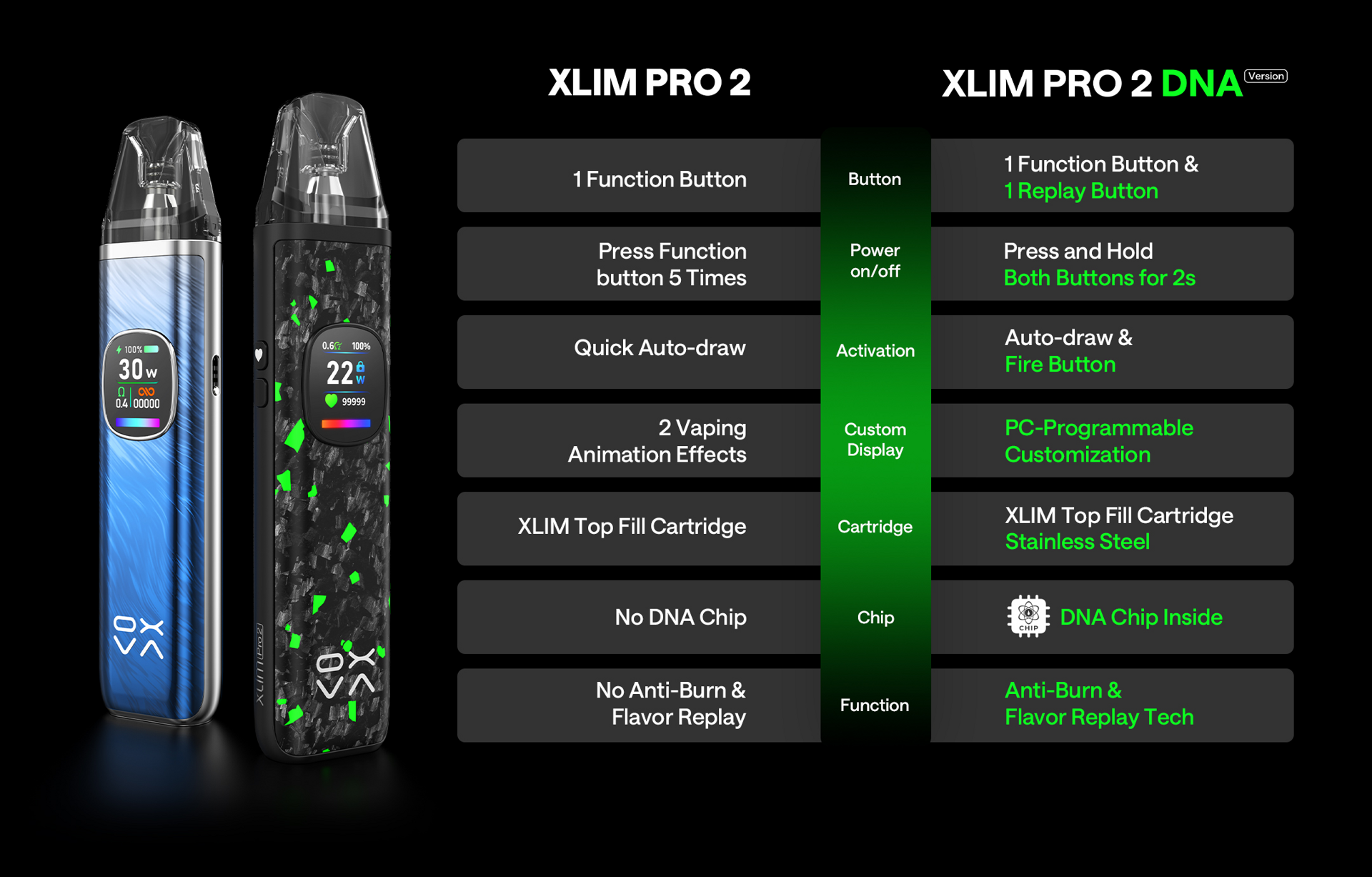 Proslulý a vysoce ceněný čipset DNA od výrobce Evolv pohání celé jádro modelu OXVA Xlim Pro 2 DNA. Čipset v mnoha ohledech daleko převyšuje jiné čipy na trhu a postará se o hladký a bezproblémový chod zařízení s maximálním důrazem na pohodlí a efektivitu. Za zmínku stojí zejména Anti-burn ochrana proti připálení cartridge, konzistentní chuť s funkcí Replay a široké možnosti doplňkového a dodatečného nastavení přes software EScribe.