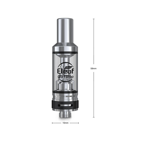 Nový a vylepšený clearomizér Eleaf GSTurbo spojuje kompaktní rozměry, stylový design a systém uzpůsobený zejména na klasické šlukování. Celé tělo je vyrobeno z kvalitní nerezové oceli a pyrexového skla. Ve vrchní části se nachází odnímatelný náustek typu 510, který lze snadno nahradit za libovolný náustek se stejným závitem dle vašich preferencí.