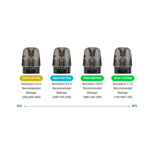 Společně s novou řadou Eleaf iVeni uvádí výrobce na trh také novou platformu stejnojmenných cartridgí. V základním balení na vás potom čekají rovnou dvě cartridge, první nabídne odpor 0,4 ohm a je ideální pro volné RDL vapování. Druhá cartridge disponuje odporem 0,8 ohm a využijí ji milovníci klasického MTL šlukování. Samostatně si můžete k e-cigaretě pořídit také další odpory a rozšířit tak možnosti zařízení zase o krok dále.