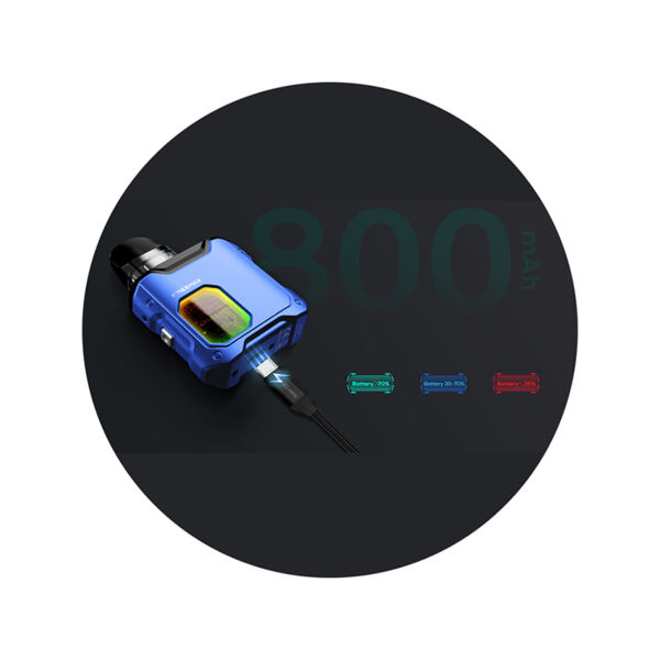V kompaktním těle zařízení se ukrývá integrovaná baterie s velkou kapacitou 800 mAh, která si poradí s intenzivním vapingem a nabídne stabilní chod a dlouhou výdrž. O stavu baterie vás navíc informuje LED dioda jednou ze tří barev, pro zjištění stavu stačí jednou stisknout boční tlačítko. V případě nutnosti můžete baterii kdykoliv opětovně dobíjet pomocí portu USB-C ve spodní části.