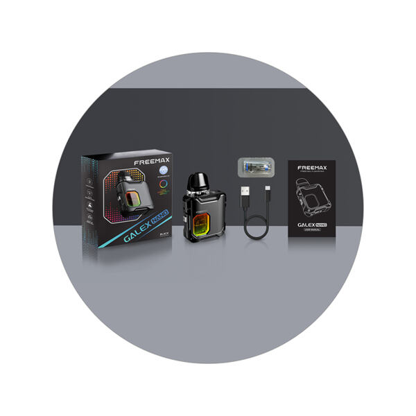 Hlavním prvkem modelu Galex Nano je přítomnost bočního průzoru s osvětlením, skrz průzor si můžete prohlédnout elektroniku uvnitř zařízení, LED dioda v průzoru potom slouží jako indikace stavu baterie, nebo indikace zvoleného režimu výstupu. V přední části se nachází ovládací tlačítko, které slouží pro zapnutí a vypnutí e-cigarety, pro zjištění stavu baterie, nebo pro nastavení jednoho ze tří režimů výstupního napětí. Tlačítkem lze také upravovat podsvícení LED diody, během potahování tak můžete vyzkoušet duhové podsvícení, nebo jednobarevné. V případě potřeby se dá podsvícení během potahu zcela deaktivovat. Ve vrchní části modelu Galex Nano se nachází cartridge Galex Pod s objemem 2 ml a jednoduchým vrchním plněním s dětskou pojistkou. V balení na vás potom čekají hned dvě tělíska GX Mesh s odpory 0,8 ohm a 1,0 ohm, které disponují kvalitním nerezovým mesh pletivem v jádru a nabídnou nekompromisně výrazné a plné podání chuti. Freemax Galex Nano Pod Kit je vynikající model ze série Galex, který dokáže oslovit jak naprosté začátečníky, tak také pokročilé uživatele.