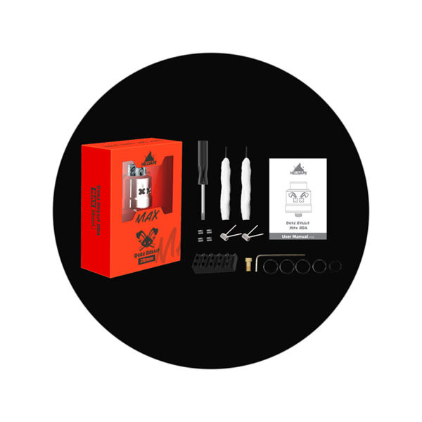 Hellvape Dead Rabbit Max RDA je dokapávací atomizér, který skvěle poslouží jak na standardní kapání e-liquidu přímo na spirálky, tak také pro vapování ze squonk modu. V základním balení na vás čeká dutý BF pin, který je možné našroubovat do spodního závitu. Přímo pod spirálkami je potom umístěna spodní část se 7 mm hlubokým bazénkem na bezproblémové zásobení atomizéru e-liquidem během squonkování.
