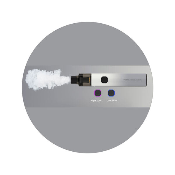 E-cigareta Sceptre Tube Pod Kit pracuje hned se dvěma výstupními režimy výkonu, mezi kterými si můžete pohodlně přepínat pomocí spínacího tlačítka v přední části. V prvním režimu pracuje e-cigareta s výkonem 18 W, druhý režim nabídne výkon 20 W. Režim s výkonem 18W lze použít pro utaženější potah, druhý režim 20 W poté na volnější vaping. Ovládání je nesmírně snadné a intuitivní.