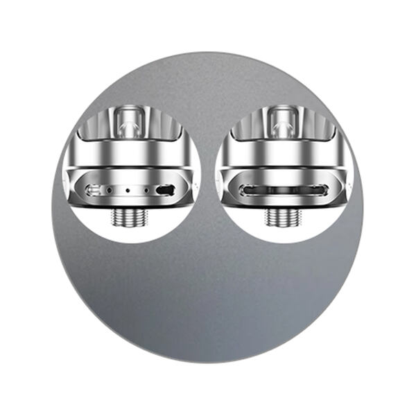 Clearomizér přichází také s vylepšeným systémem airflow. Ten se nachází ve spodní části clearomizéru. Plynulým otáčením kroužku si tak přizpůsobíte tuhost potahu svým představám. K dispozici je široký otvor pro RDL vaping, nebo řada menších otvorů pro MTL. Vzduch si nastavíte během pár vteřin.