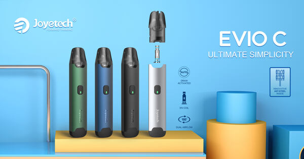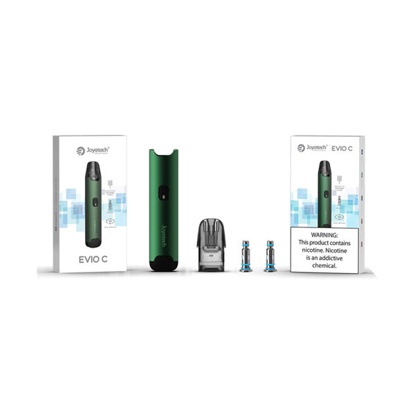 Joyetech EVIO C Pod Kit je jednoduchá elektronická cigareta typu pod, kterou ocení hlavně nenároční uživatelé a začátečníci, kteří se poohlíží po první e-cigaretě pro klasické šlukování (MTL). Nabídne hned několik stylových prvků, díky kterým si vás snadno získá. Kompaktní tělo s rozměry 22,5 x 12,7 x 116,6 mm nabídne perfektní ergonomii pro pohodlné držení v ruce. Výhodou modelu EVIO C je potom přítomnost hned dvou metod spínání potahu. Pro sepnutí žhavení tak můžete využít tlačítko v přední části, nebo automatické spínání pouhým potažením z náustku. V těle se nachází integrovaná baterie s kapacitou 800 mAh. O stavu baterie vás bude neustále informovat LED dioda umístěná přímo ve spínacím tlačítku.