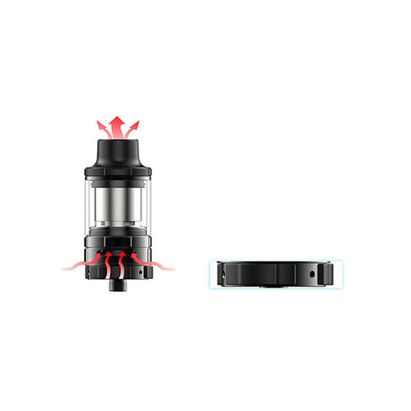Ve spodní části atomizéru se nachází plně regulovatelný systém airflow s jedním regulačním kroužkem. Otáčením tohoto kroužku můžete do velké míry ovlivnit výslednou produkci páry a užívat si výkonné přímé potahování, cloud chasing, nebo pohodovější a mírnější DL vaping.