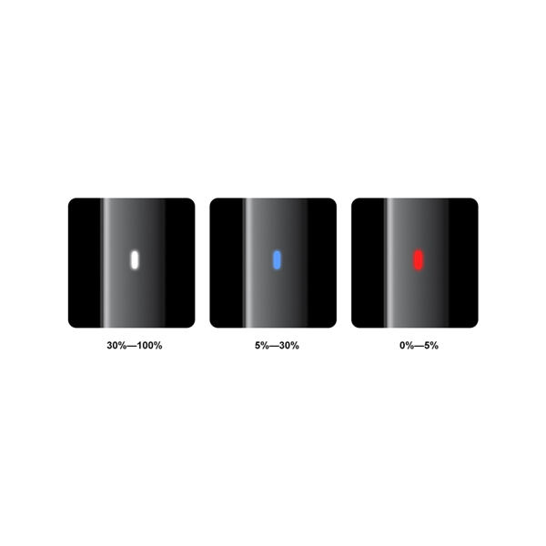 O aktuálním stavu baterie vás bude během vapování a užívání neustále informovat praktická indikační dioda na předním panelu. Dioda mění svou barvu dle aktuálního procentuálního stavu baterie. Pokud máte plně nabito, svítí dioda bíle. Pokud klesne kapacita na 30%, rozsvítí se modrá dioda. Jestliže bude zbývat pouze 5% baterie, bude svítit červeně. Jednoduše tak poznáte, že je čas připojit zdroj napájení.