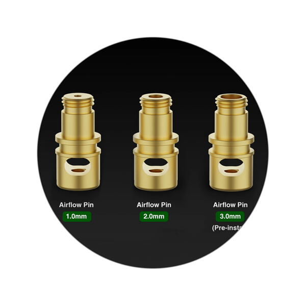 Spodní kontakt boro tanku tvoří pin se vzduchovou vložkou, která ovlivní výslednou tuhost při potahování a jaké množství vzduchu do tanku vstoupí. V balení na vás čekají hned tři piny s průměry 1mm, 2mm a 3mm pro potřeby všech typů vapování.
