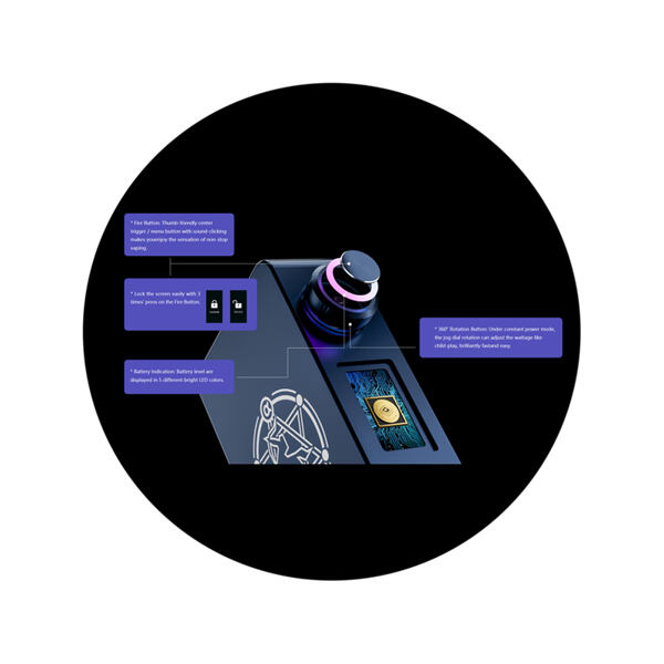 Společně s upgradovanou verzí čipu Quest 2.0 přináší výrobce Lost Vape také kompletně upravené a předělané uživatelské ovládání. Na předním panelu se nachází inovativní ovládací tlačítko 3v1, které poslouží jako spínač žhavení, zámek modu, indikátor stavu baterie a zároveň jako regulační prvek samotného výkonu. Spínačem je možné pohodlně otáčet a během pár vteřin si přizpůsobit potřebný výkon. Veškeré ovládání tak máte hezky na jednom místě.