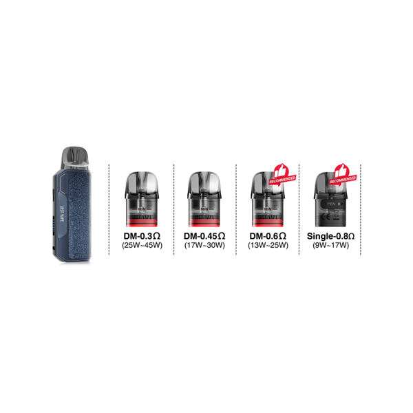 Zajímavostí modelu Lost Vape Thelema Elite S Pod Kit je kompatibilita s kompletní platformou všech cartridgí Lost Vape E-Plus. Do zařízení tak můžete vložit jak moderní cartridge E-Plus Dual Mesh s libovolným odporem, tak také originální cartridge E-Plus Pod a druhou generaci E-Plus Pod V2 Upgraded. Samozřejmostí je pak také kompatibilita s RBA cartridgí Lost Vape E-Plus. V základním balení najdete jednu cartridge E-Plus Dual Mesh s odporem 0,6 ohm, všechny ostatní série a odpory si můžete k e-cigaretě pořídit samostatně.