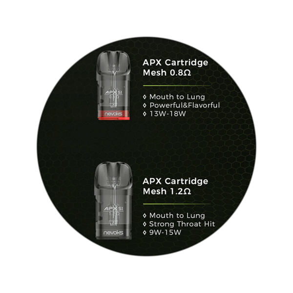 Přímo na těle modelu Nevoks APX S1 Pod Kit se nenachází žádné ovládací tlačítko, potřebné hodnoty si e-cigareta dokáže nastavit automaticky díky inteligentní detekci odporu. Žhavení probíhá rovněž zcela automaticky, postačí jen přiložit ústa k náustku a potáhnout. Model Nevoks APX S1 Pod Kit je kompatibilní s platformou cartridgí APX Mesh, které disponují objemem 2 ml a integrovanou žhavící hlavou s mesh pletivem pro skvělé podání chuti a efektivní náběh žhavení. Mimo tělo e-cigarety najdete v balení jednu cartridge z této platformy, ta nabídne odpor 0,8 ohm a je ideální volbou pro milovníky MTL šlukování. Zajímavým prvkem je potom možnost ovlivnění tuhosti potahu, cartridge je možné na tělo nasadit jedním ze dvou směrů, každý směr potom dodá odlišnou tuhost. Jednoduché funkce, skvělé podání chuti, precizně navržená konstrukce a kompaktní rozměry, to vše činí z tohoto modelu neodolatelný kousek pro začínající a nenáročné uživatele, stejně jako pro ty pokročilé, kteří hledají praktickou e-cigaretu do kapsy.
