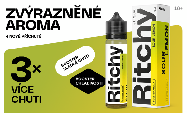 Příchutě Ritchy S&V od evropské společnosti Liqua nabídnou výraznější aroma a skutečně prémiový zážitek při každém potáhnutí. Vychutnejte si tyto jedinečné ovocné směsi a zamilujte se do jejich výrazné, bohaté, plné a nezaměnitelné chuti. Všechny příchutě Ritchy by Liqua jsou vyrobeny na území EU a splňují všechna kritéria pro uvedení na trh. Jsou vyrobeny jen z těch nejkvalitnějších surovin pro vynikající chuťové podání. Příchutě Ritchy jsou dodávány ve velké 60ml lahvičce, ve které se nachází 12ml příchutě. Díky systému shake & vape stačí pouze dolít bázi a začít potahovat bez potřeby zrání.