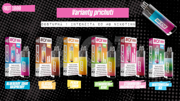 Každá jednorázová e-cigareta nabízí až 1000 potahů plných intenzivní, dokonale vyvážené chuti prémiového e-liquidu Riot Labs. Na výběr je 6 jedinečných příchutí, pečlivě vyladěných tak, aby uspokojily jak milovníky sladkých ovocných bomb, tak fanoušky svěžích a lehkých tónů.