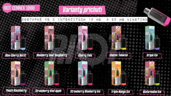 Předplněné kapsle RIOT Connex jsou esencí jednoduchosti a maximální chuti. Každá kapsle je precizně naplněna prémiovým e-liquidem RIOT Labs, který zaručuje plný, výrazný a konzistentní projev až do posledního potahu. Díky uzavřené konstrukci nehrozí žádné protékání, žádné doplňování, žádné starosti – jen nasadit, zacvaknout a vapovat. Díky široké nabídce chutí si každý najde svého favorita – od sladkých ovocných mixů až po svěží & cool varianty.