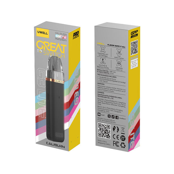 Dostupná elektronická cigareta Uwell Caliburn G3 Lite Pod Kit navazuje na zaběhnutou tradici vyladěných pod systémů Caliburn, přináší opět maximální důraz na výraznou chuť a jednoduché funkce pro snadné používání. Model G3 Lite přináší kompatibilitu s platformou cartridgí Caliburn G3, které dlouhodobě ohromují kvalitně zpracovanou konstrukcí a výrazným podáním chuti díky nejnovějším technologiím výroby. Integrovaná baterie s kapacitou 1200 mAh zajistí déletrvající požitek z vapingu s minimem nabíjení a funkce automatického nastavení výkonu s automatickým spínáním potahu se postarají o komfortní každodenní vaping.
