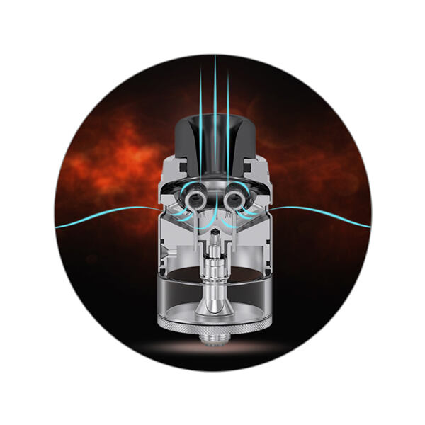 Verze V4 atomizéru Pyro přináší přepracovaný a promyšlený systém airflow. Ten je umístěn ve vrchní části a efektivně ofukuje instalované spirálky v krátké dráze, díky čemuž získáte při každém potahu plnou a výraznou chuť ve spojení s obrovskou produkcí páry. Systém airflow je plně regulovatelný, pohodlně si tak budete moci nastavovat také samotnou tuhost potahu.