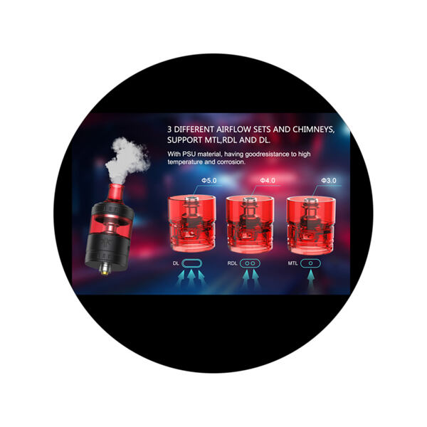 Všechny formy vapingu v jednom jediném těle. To nabízí Vandy Vape Requiem RTA. Součástí balení jsou tři komory s rozdílnými vzduchovými otvory a odlišnými průměry středového komínu pro možnost využití hned na tři různé formy vapování, tedy na MTL, DL a RDL vaping. Pro DL je připravena komora se širokým airflow a středovým komínem 5 mm, pro MTL je určena komora s úzkým průměrem airflow a průměrem komínu 3 mm a pro RDL vaping se můžete těšit na dva menší airflow otvory a průměr 4 mm.