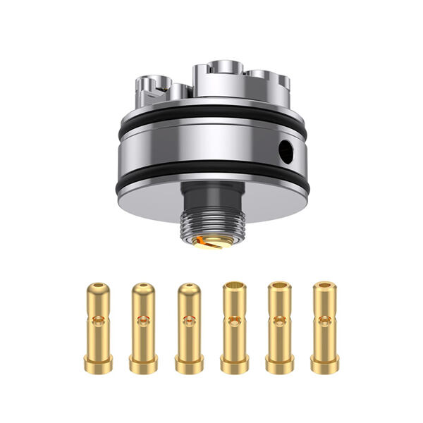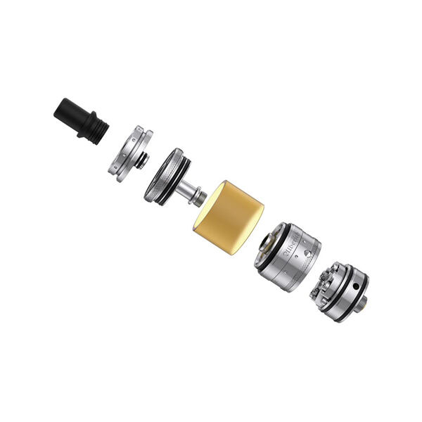 V jádru clearomizéru Alberich MTL RTA na vás čeká stylová základna se dvěma protilehlými sloupky, která umožňuje hladkou instalaci jedné spirálky dle vlastního výběru. Kontakty pro usazení spirálky nabídnou dostatek prostoru a montáž je proto nesmírně snadná a sama o sobě také jednoduchá pro začátečníky. O co nejlepší požitek z MTL potahu se postará pečlivě navržený systém airflow. Ve spodní části najdete kroužek pro regulaci přísunu vzduchu a samotnou tuhost potahu budete moci ještě vylepšit díky praktickým vzduchovým vložkám, které se instalují přímo do závitu ve spodní části. V základním balení na vás čekají vložky s průměry vzduchového otvoru 0,8 mm, 1,0 mm, 1,3 mm, 1,6 mm, 2,0 mm a 2,5 mm. Optimální přenos páry do úst obstará úzký podlouhlý náustek s uchycením typu 510 ve vrchní části. Vapefly Alberich MTL RTA je špičkový motací atomizér pro klasické šlukování, od kterého se jen tak neodtrhnete.