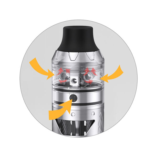Pro zisk maximálně prokreslené chuti je clearomizér Brunhilde 1o3 vybaven pokročilým systémem airflow. Spirálky u atomizéru jsou ofukovány pomocí bočního systému, který tvoří celá řada menších otvorů pro rovnoměrný ofuk. U základny se pak navíc nachází speciální vzduchová vložka pro nasávání vzduchu také pod spirálky. Tato vložka je vyměnitelná, v základním balení najdete hned dvě rozdílné vložky, které vám zprostředkují rozdílný styl DL potahu.