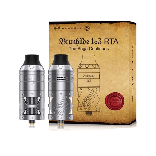 Vapefly Brunhilde 1o3 RTA jde ve šlépějích předchozího DL modelu Brunhilde RTA. Z první generace si osvojuje hned několik prvků, tím nejdůležitějším je potom top coiler konstrukce. Základna je tak umístěna ve vrchní části a e-liquid je přiváděn k základně pomocí ocelových vláken ze spodního tanku. Pro účinné zásobování je atomizér opatřen hned šesti sloty pro šest ocelových drátů, použít můžete také standardní konfiguraci se čtyřmi dráty, kdy postačí dva zbývající sloty zaslepit.