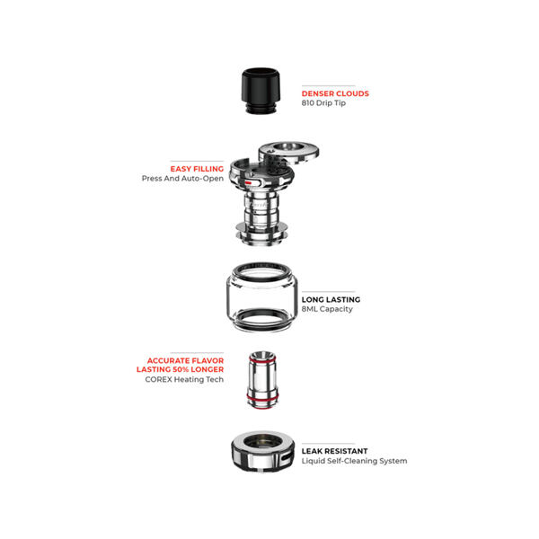 V případě nutnosti opětovného doplnění obrovského tanku je atomizér vybaven praktickým vrchním systémem plnění se speciální pojistkou. Tu postačí stisknout a následně jen vysunout celý vrchní uzávěr do strany. Nic není potřeba složitě šroubovat, nebo odpojovat. Do plné kapacity máte opětovně doplněno během pár vteřin, poté se můžete opět uchýlit k vapování.
