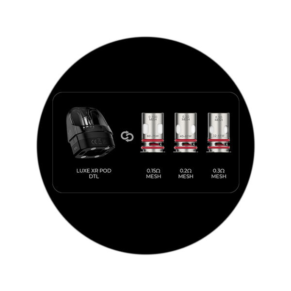 Cartridge XR Pod v základním balení je kompatibilní se žhavícími hlavami z platformy GTX. Tato platforma nabídne celou řadu různorodých odporů a typů žhavících hlav. V základním balení na vás čeká tělísko GTX Mesh s odporem 0,2 ohm a GTX Mesh s odporem 0,4 ohm. Model LUXE XR MAX je zároveň zpětně kompatibilní také s cartridgemi LUXE X s integrovanými hlavami, které se dají pořídit samostatně.