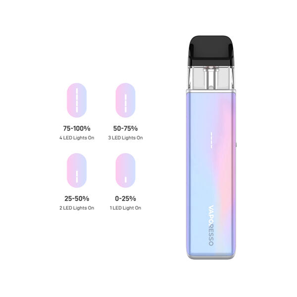 Přední část e-cigarety XROS 5 Mini zdobí praktická indikační dioda, kterou tvoří čtyři oddělené čárky. Skrz tuto indikaci budete mít neustálý přehled o aktuálním stavu vaší baterie. Indikátor je velice detailní a určuje zbývající kapacitu odděleně po 25% procentech, nemusíte tak mít obavy, že byste nedokázali dopředu předem určit, kolik vám zbývá baterie.