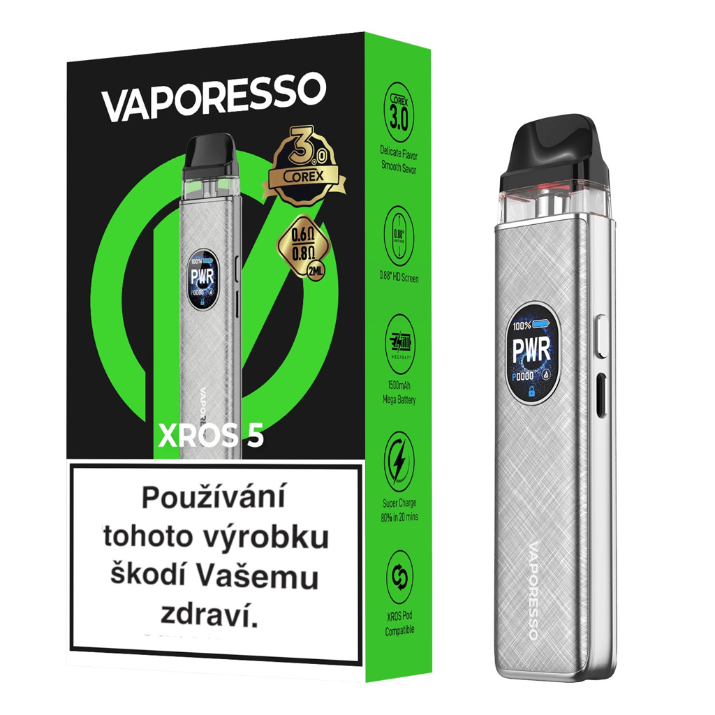 Vaporesso XROS 5 Pod Kit je již pátou generací legendární e-cigarety pro všechny nadšence do MTL a RDL potahu, kteří hledají profesionální požitek z vapování a ideální kousek pro svůj životní styl. Model je tentokrát poháněn vysokokapacitní integrovanou baterií 1500mAh s podporou extrémně rychlého super charge nabíjení 3A. Vylepšená a pokročilá technologie COREX 3.0 vám zajistí konstantní a stabilní reprodukci bohaté chuti, která je delikátní a jemná doslova při každém potahu. Nastavitelná úroveň intenzity žhavení a manuální regulace airflow zajišťují velice jednoduchou a praktickou uživatelskou obsluhu. Se zakulaceným HD displejem a šesti nastavitelnými schématy navíc zařízení poskytne uživatelům zábavné a interaktivní používání. Vaporesso XROS 5 Pod Kit zdárně navazuje na své předchůdce a přináší zase něco nového.