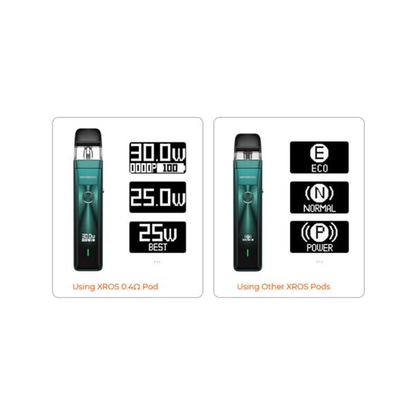 Díky pokročilému čipsetu v těle zařízení se můžete těšit také na obrovskou variabilitu při výběru vhodného nastavení pro vaši cartridge. Pokud zařízení osadíte standardní cartridgí s odporem 0.4Ω ze základního balení, můžete si pohodlně regulovat výkon až do 30W. Jestliže osadíte zařízení cartridgí ze série XROS s jiným odporem, budete si moci zvolit jeden ze tří režimů ECO, NORMAL, nebo POWER. E-cigareta disponuje také inteligentní detekcí odporu, doporučený výkon tak nastaví automaticky po připojení cartridge.