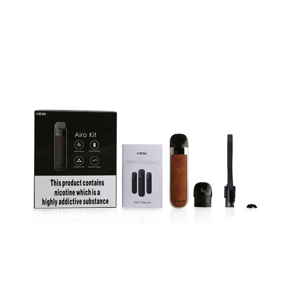 VEIIK Airo Pod Kit je nová elektronická cigareta typu pod, která vám zprostředkuje mimořádný chuťový zážitek, ale příjemně potěší také oko díky svému jedinečnému designu a modernímu vzezření, kterému vévodí pohledné PU panely. Tyto polyuretanové panely imitují pravou kůži a jsou nesmírně příjemné na dotyk, e-cigaretu tak budete s chutí přenášet a vapování si budete vysloveně užívat. Díky svým praktickým rozměrům 100,5 x 25,5 x 12,5 mm také skvěle padne do každé ruky a pohodlně se s ní cestuje, nebo přenáší v kapse. Tuto jednoduchou elektronickou cigaretu tvoří dvě části - tělo baterie a cartridge. Díky tomu je údržba nesmírně jednoduchá a ocení ji tak zejména milovníci nenáročného vapingu a začátečníci, kteří hledají svou první elektronickou cigaretu pro klasické šlukování se snadným ovládáním a používáním.