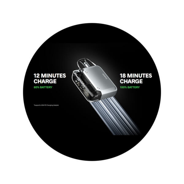 Jedním z klíčových prvků e-cigarety Argus P1 je přítomnost podpory extrémně rychlého nabíjení. Do plné kapacity se zvládne dobít už za 18 minut při zvolení odpovídajícího adaptéru. Tělo je kompatibilní s USB adaptéry se standardem PD 15W, po připojení takového adaptéru tak odpadá starost o jakékoliv nabíjení, jelikož budete moci mít e-cigaretu téměř neustále nabitou.