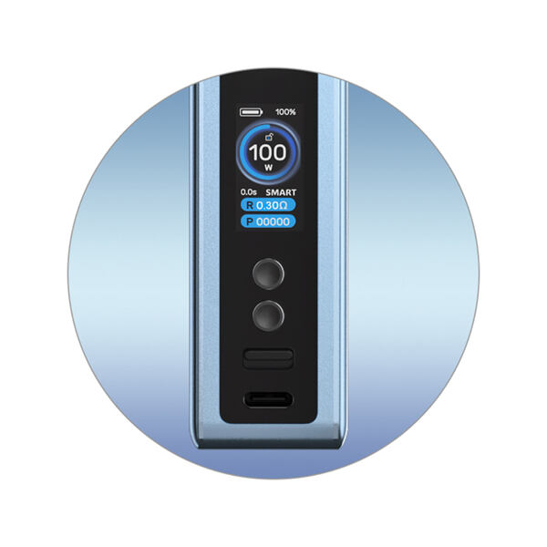 Mod s regulací výkonu a se slotem pro baterii 18650), závit 510, výstupní výkon až 100 W, USB-C nabíjení, manuální zámek zařízení, dvě schémata displeje, tři režimy výstupu, stylové podsvícení panelu, ergonomické zpracování.